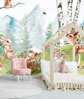 tapeta ścienna dla dzieci przedstawiająca przyjazne leśne zwierzęta: dużego brązowego misia, uroczego jelonka, małego jeża i szarego zajączka, ustawione na tle zielonej trawy i różnorodnych roślin. Z prawej strony widoczne jest drzewo z jesiennymi, żółto-pomarańczowymi liśćmi oraz sowa siedząca na gałęzi. W tle delikatny, akwarelowy las. Na pierwszym planie drewniana komoda z jasnymi szufladami, pojemnik na zabawki w kształcie głowy misia, różowy dywanik w kształcie łapki oraz drewniane łóżko z pluszowymi zabawkami, w tym szarym wielorybem.