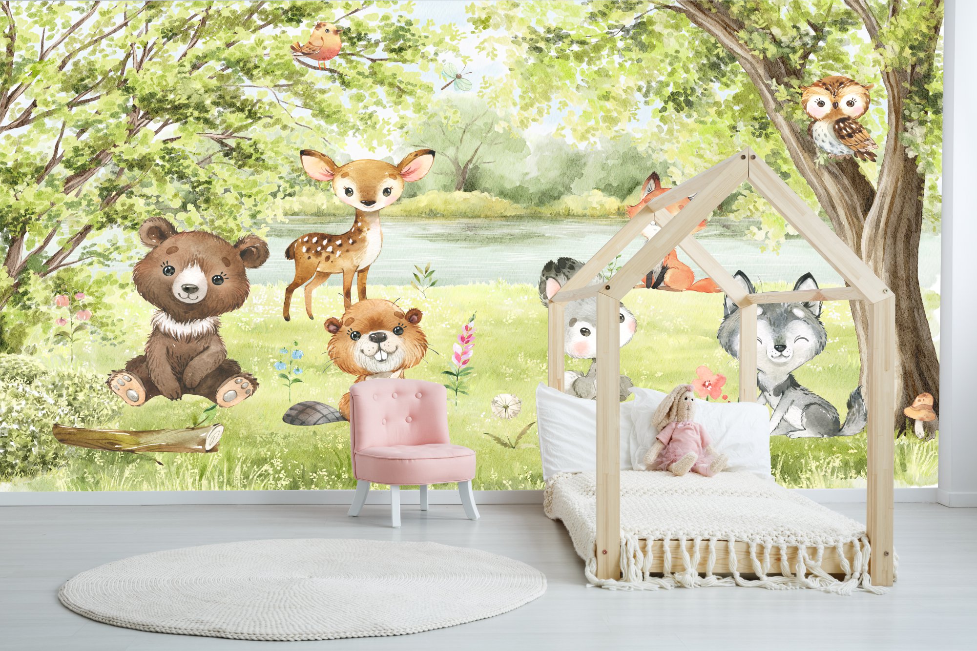 Bajkowa fototapeta dla dzieci z uroczymi zwierzątkami na leśnej polanie – miś, sarenka, lisek, wilczek i inne przyjaciele natury. Idealna do pokoju malucha, tworzy ciepły, przyjazny klimat i pobudza wyobraźnię.