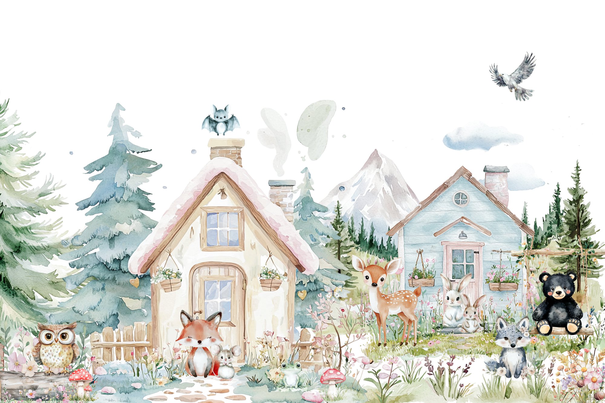 Fototapeta zwierzęta w domkach leśnych las pastelowy M200