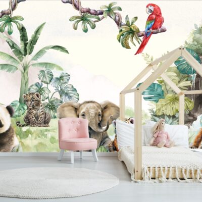 Akwarelowa fototapeta na ścianie w pokoju dziecka przedstawiająca żyrafę słonia i lwa na tle zielonej roślinności. Na pierwszym planie różowy fotel i kolorowe poduchy.