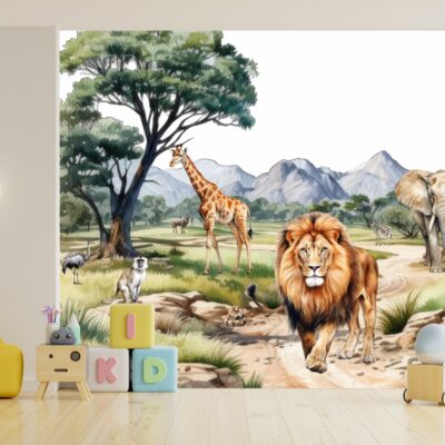 Ilustracja w stylu akwareli przedstawiająca afrykańską sawannę z dużymi drzewami i dzikimi zwierzętami. Na pierwszym planie widoczne są żyrafa, zebra, lewica, hiena i słoń, a także mniejsze zwierzęta jak żółw i jaszczurka. Całość utrzymana jest w jasnej, naturalnej kolorystyce – idealna jako fototapeta do pokoju dziecięcego.